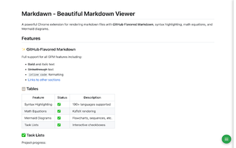 Entre os principais recursos estão a realce de sintaxe para mais de 190 linguagens de programação, listas de tarefas interativas e links âncora para navegação interna. Markdawn é perfeito para ler arquivos README, visualizar documentos localmente ou revisar anotações em Markdown, oferecendo um design responsivo e limpo que se adapta a diferentes tamanhos de tela.